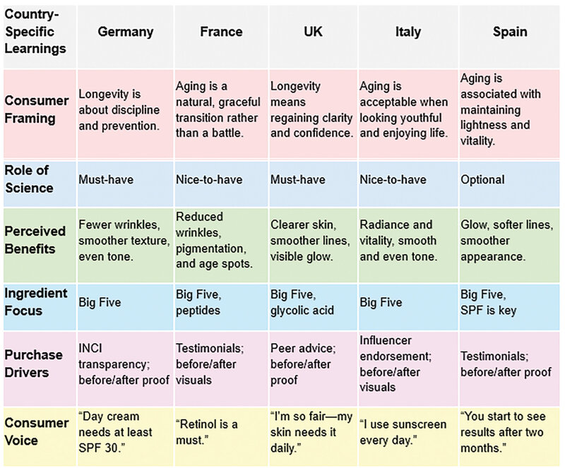 This study explores how European consumers articulate skin aging and longevity through an AI-enabled analysis of authentic online discussions in Germany, France, the UK, Italy, and Spain. Using natural language processing across forums and social platforms, it identifies shared foundations and culturally distinct emotional framings. A consistent set of trusted active ingredients emerges, while motivations and proof expectations vary by country. Consumers also increasingly link skin health to combined topical and oral routines. The findings show how AI-driven insights can support targeted product development and communication in the visible longevity segment.