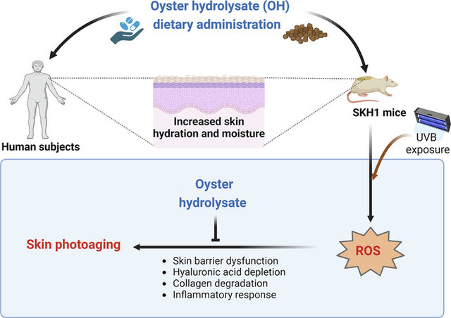 L'esposizione ai raggi ultravioletti (UV) provoca l'invecchiamento della pelle principalmente attraverso l'interruzione della funzione di barriera cutanea, con conseguente disidratazione della pelle e formazione di rughe. L'idrolizzato di ostrica (OH), come alimento funzionale, è stato valutato per i suoi effetti antitumorali, antiossidanti e antiapoptotici.