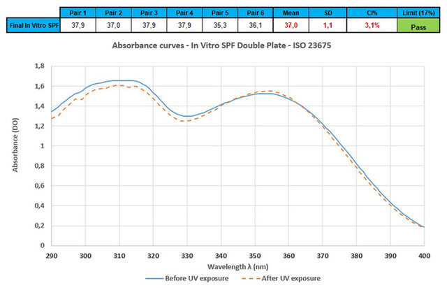 Figura 1. Esempio di SPF in vitro secondo metodo ISO 23675, calcolo finale.
