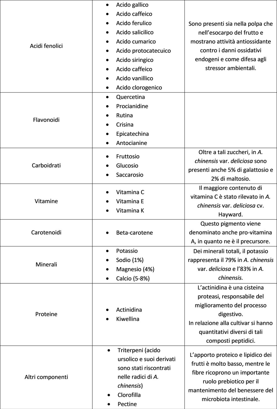 Lo studio della composizione chimica dei frutti delle piante del genere Actinidia ha permesso di evidenziare e quantificare la presenza di numerosi composti, alcuni dei quali importanti risorse per un’alimentazione bilanciata, ma di interesse anche in altri campi della salute umana quali il settore farmaceutico e degli integratori alimentari (10, 11, 13, 17, 18, 19).