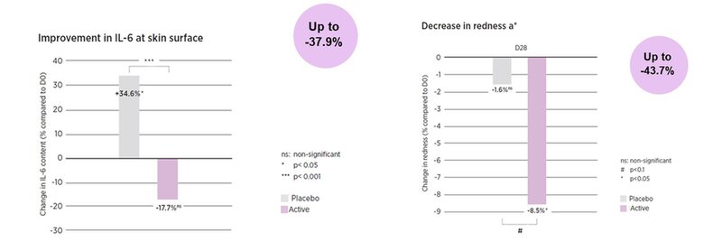 La valutazione di efficacia in vivo ha permesso di dimostrare che l’attivo è in grado di ridurre la produzione di IL-6 del 37,9% e di diminuire il rossore cutaneo dell'8,5%. I partecipanti hanno riportato un miglioramento del benessere cutaneo, con una riduzione della reattività cutanea già dopo una settimana di applicazione (Figura 4 ).