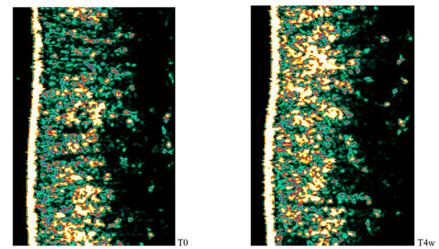 La valutazione dello spessore dell'epidermide e del derma e della densità dermica è stata eseguita mediante un ecografo ad ultrasuoni (DermaScan ® C, Cortex Technologies) contenente un trasduttore da 20 MHz, che consente l'acquisizione in vivo di immagini in sezione fino ad una profondità di 2,5 cm.
