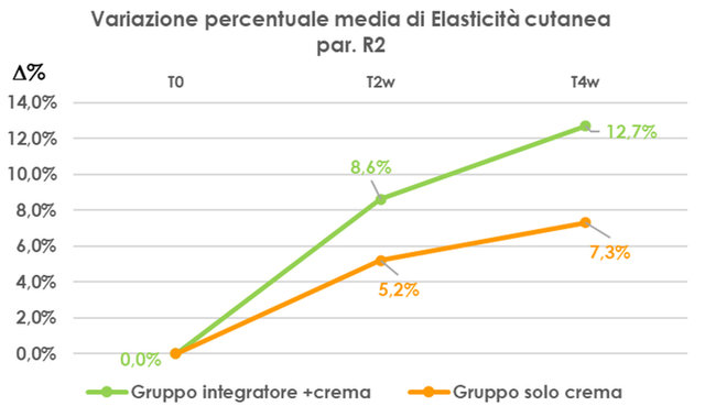 Figura 1. Variazione percentuale media di Elasticità cutanea espressa col parametro R2 di entrambi i gruppi di studio. Tutti i dati sono statisticamente significativi P<0.05.