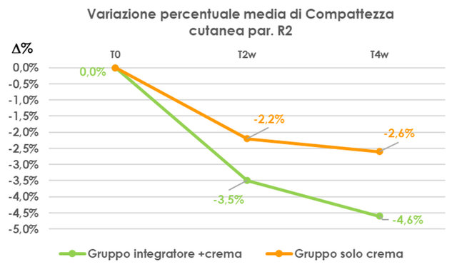 Inoltre è stata valutata la compattezza cutanea analizzando il parametro R0 (Firmness), sempre mediante Cutometer® DUAL MPA 580 (Courage & Khazaka), capace di misurare la direzione delle fibre di collagene ed elastina, valutazioni molto importanti per determinare le proprietà meccaniche della pelle e del suo invecchiamento.