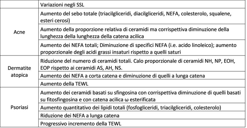 Alterazioni degli SSL da SC e sebo sono state riscontrate nella maggioranza delle condizioni cutanee. Questi cambiamenti possono consistere in riduzione della concentrazione e della lunghezza della catena acilica o sostituzioni del gruppo di testa nei ceramidi, aumento dell'insaturazione o riduzione nella lunghezza dei NEFA, o variazioni del rapporto tra Ceramidi, NEFA e colesterolo.