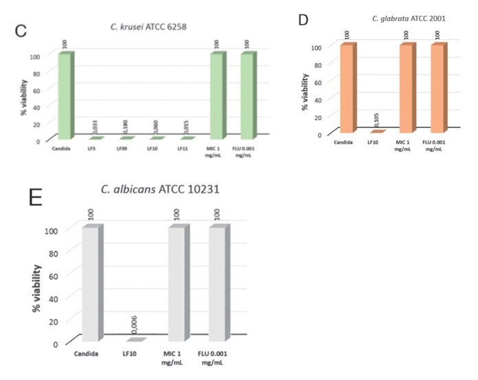 In particolare, i risultati hanno dimostrato l’efficacia inibitoria di L. fermentum LF10 nei confronti di cinque diverse specie di Candida: C. parapsilosis, C. albicans, C. tropicalis, C.krusei, C. glabrata. Nello stesso studio è stata comparata l’azione del ceppo probiotico con quella di azoli largamente utilizzati nel trattamento farmacologico come miconazolo e fluconazolo.