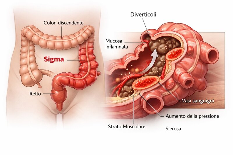 Il sigma presenta caratteristiche anatomo-funzionali che giustificano la sua vulnerabilità: il calibro ridotto e la marcata attività segmentaria determinano pressioni intraluminali più elevate rispetto ai tratti prossimali del colon. In condizioni di transito rallentato, la maggiore permanenza del contenuto fecale nel colon distale favorisce disidratazione e compattamento delle feci, con incremento dello sforzo evacuativo e aumento della pressione endoluminale.
