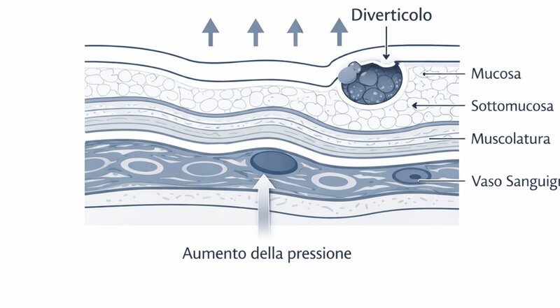 Queste condizioni predispongono alla protrusione mucosale nei punti di debolezza della parete colica, tipicamente in corrispondenza dei vasi penetranti.