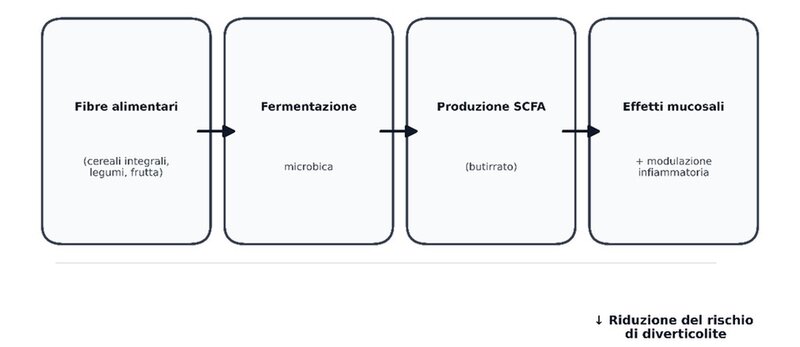 Le evidenze disponibili supportano un ruolo centrale della dieta nella gestione della diverticolosi e nella prevenzione delle complicanze. Un adeguato apporto di fibre, soprattutto da fonti vegetali integrali, si associa a riduzione del rischio di diverticolite e ospedalizzazione, mentre un consumo elevato di carni rosse e un pattern occidentale risultano correlati a maggiore probabilità di eventi acuti (4, 8).