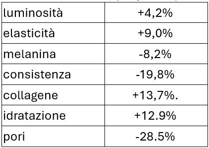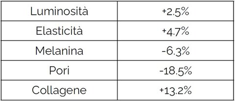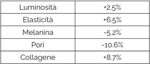 I parametri utilizzati per verificarne l’efficacia sono: la luminosità, l'idratazione, l'elasticità, il valore della melanina, il numero dei pori, la consistenza e il contenuto di collagene della pelle per un periodo compreso tra 4 e 12 settimane (2).